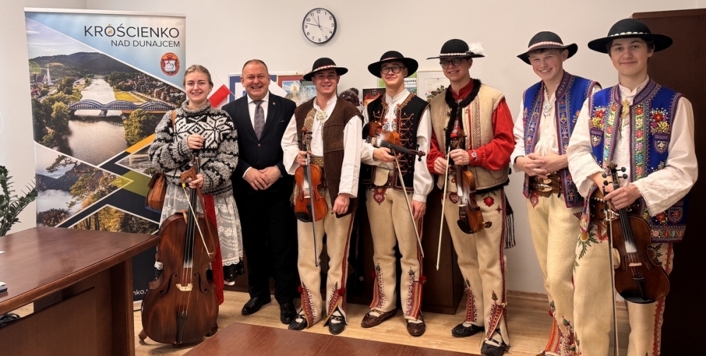 W przedświątecznej, pełnej serdeczności atmosferze Wójta Gminy Krościenko nad Dunajcem odwiedzili przedstawiciele Kapeli Śmiałki oraz Zespołu Pieśni i Tańca Pieniny. Artyści złożyli śpiewające życzenia noworoczne, wprowadzając do urzędu klimat tradycji, kolędy i góralskiej radości. Spotkanie było okazją do rozmów, wspólnych zdjęć oraz podkreślenia znaczenia lokalnej kultury i folkloru w życiu gminy.