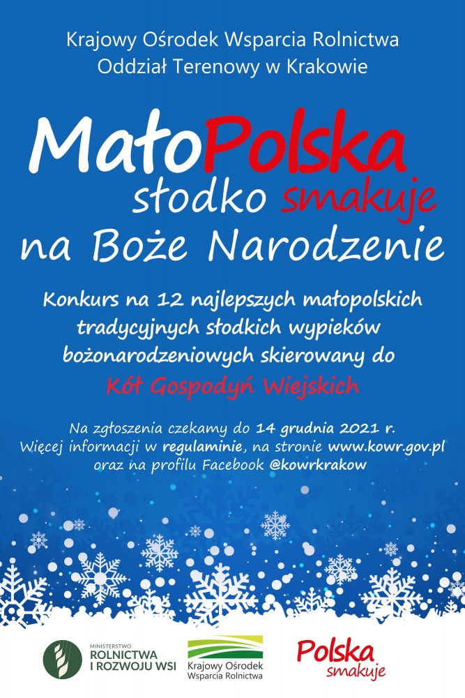 Oddział Terenowy Krajowego Ośrodka Wsparcia Rolnictwa w Krakowie serdecznie zaprasza Koła Gospodyń Wiejskich z terenu województwa małopolskiego do wzięcia udziału w konkursie „MałoPolska słodko smakuje na Boże Narodzenie”.