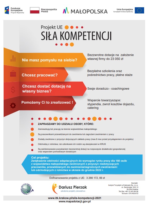 Instytut Turystyki w Krakowie Sp. z o. o. zaprasza do udziału w projekcie Siła kompetencji realizowanego w ramach Podziałania 8.4.2 Adaptacja do zmian, współfinansowanego w ramach Regionalnego Programu Operacyjnego Województwa Małopolskiego na lata 2014-2020. Projekt realizowany jest w okresie od 15.02.2021-31.12.2022.