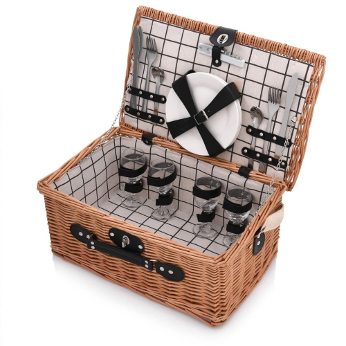 - DUKA PICKNICK dla czterech osób, to kosz wiklinowy, który absolutnie zachwyca swoim wykonaniem. To kosz z wikliny, wyposażony w wygodną materiałową rączkę na froncie. Kosz można przenosić także z wykorzystaniem bawełnianego paska, zamocowanego po obydwu bokach koszyka. W jego przestronnym wnętrzu znajdziemy dobrze umocowane: - cztery porcelanowe talerzyki; - cztery szklane kieliszki; - cztery noże, cztery widelce i cztery łyżeczki; - jeden korkociąg.Wymiary tego kosza piknikowego to 46x30x22 centymetrów, z łatwością zatem umieścimy w nim prowiant i napoje dla kilku osób. Podobnie jak w przypadku wersji dla dwojga, tak i w tej wnętrze kosza zostało wyłożone miękkim bawełnianym materiałem, zapewniającym bezpieczne transportowanie zawartości.