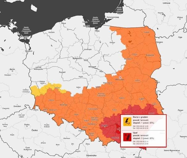 Temperatura minimalna w nocy wyniesie od 18°C do 21°C, nie przyniesie zatem wytchnienia od upałów. Ostrzeżenie trzeciego stopnia obowiązuje do 1 lipca 2022 do godz. 20.00.
