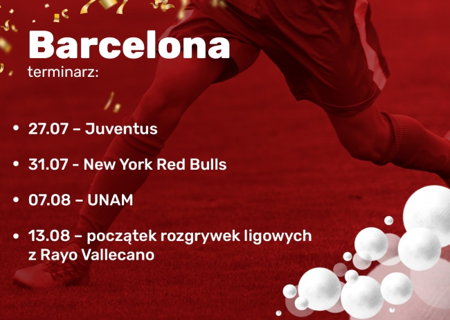 Barcelona ma już przed sobą tylko 3 mecze towarzyskie, w których będzie mogła sprawdzać swoją formę przed rozpoczęciem rozgrywek ligowych. Tym samym Xavi nie ma za dużo czasu, aby wkomponować nowych piłkarzy do swojego systemu. Duma Katalonii już w najbliższym czasie zmierzy się we wspomnianym meczu z Juventusem, a kilka dni później sprawdzi kolejnego przeciwnika z MLS. Ostatnim rywalem Blaugrany będzie meksykański UNAM, a następnie Barca wróci do Hiszpanii, aby przygotować się do pierwszego meczu ligowego.