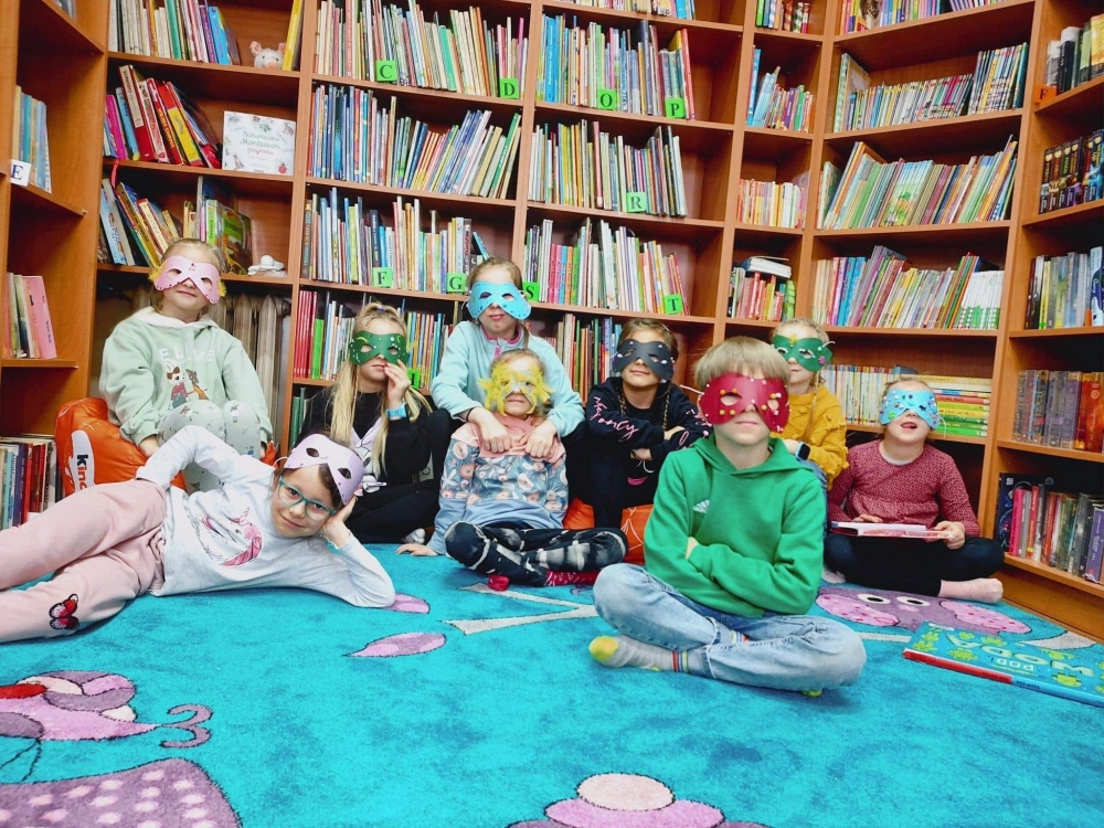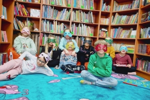 Pierwszego dnia Miejska Biblioteka Publiczna zorganizowała warsztaty pn.”Ferie z biblioteką”, podczas których uczestnicy wykonywali kolorowe i błyszczące maski karnawałowe. Oczywiście nie mogło zabraknąć głośnego czytania zimowych opowieści oraz tworzenia ilustracji do nich. Była też zabawa przy grach planszowych i zespołowych.