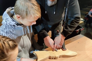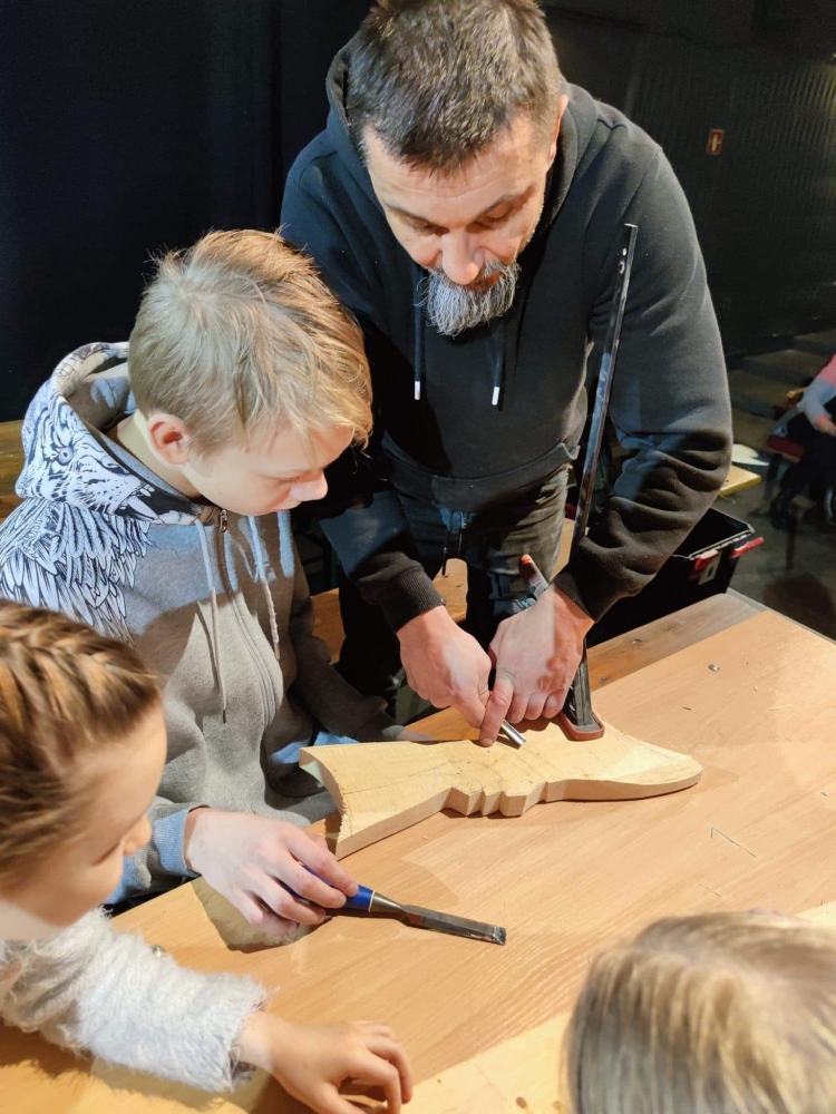 W środę odbyły się zajęcia z rzeźbiarstwa z Markiem Dziedziną. Młodzi rzeźbiarze mieli okazję za pomocą odpowiednich narzędzi rzeźbić w naturalnym drewnie. Pan Marek podczas zajęć zaprezentował jak przenieść na kawałek drzewa wybrany motywy.