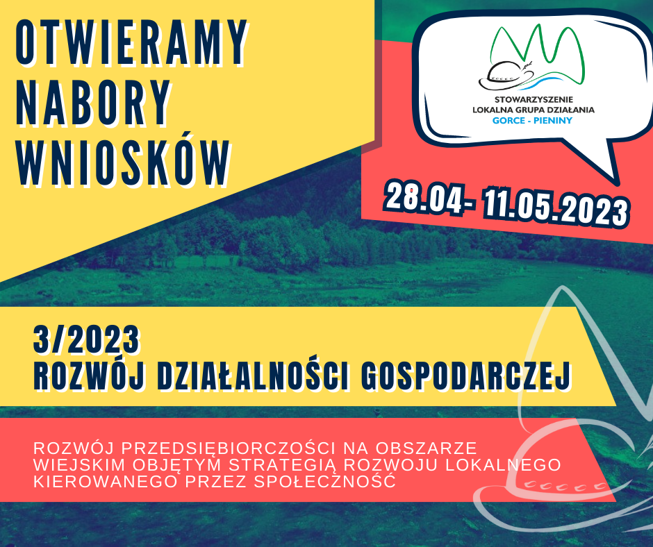Stowarzyszenie Lokalna Grupa Działania „Gorce-Pieniny” działająca na terenie gmin: Czorsztyn, Krościenko n/D, Ochotnica Dolna, Szczawnica informuje o możliwości składania wniosków o przyznanie pomocy na operacje z zakresu: rozwoju przedsiębiorczości na obszarze wiejskim objętym strategią rozwoju lokalnego kierowanego przez społeczność przez rozwijanie działalności gospodarczej w ramach poddziałania „Wsparcie na wdrażanie operacji w ramach strategii rozwoju lokalnego kierowanego przez społeczność” objętego Programem Rozwoju Obszarów Wiejskich na lata 2014-2020 z udziałem środków Europejskiego Funduszu Rolnego na rzecz Rozwoju Obszarów Wiejskich.