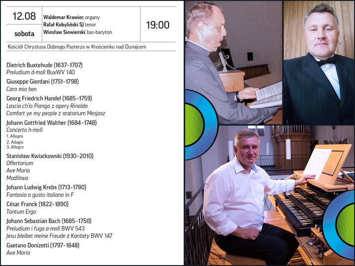 Koncert stanowić będzie swego rodzaju zamykającą klamrę festiwalu Pieniny-Kultura-Sacrum, bowiem wśród wykonawców znajdą się ci, którzy jako pierwsi przed ponad dekadą wystąpili w Krościenku n.D: tenor - jezuita Rafała Kobylińskiego (który choć występował na przestrzeni lat kilka razy w różnej artystycznej konfiguracji, swoim pięknym głosem wypełnił wnętrze pierwszej edycji festiwalu), jak również organista Waldemar Krawiec, który wystąpił podczas drugiej odsłony letnich koncertów. W sobotę zaprezentują się wspólnie wraz z barytonem, Wiesławem Siewierskim, który gościć będzie w Krościenku n.D. po raz pierwszy. W programie koncertu, oprócz klasyki organowej, znajdą się utwory wokalne, zarówno w odsłonie solowej, jak również w duecie. Festiwalowi towarzyszyć będzie wystawa przygotowana przez Stowarzyszenie Artystów Pienińskich pn. "Cisza". Wstęp wolny.