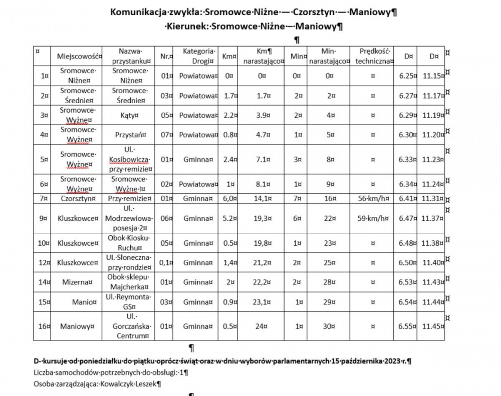 Szczegółowy rozkład jazdy na trasie Sromowce Niżne – Maniowy oraz Maniowy – Sromowce Niżne dostępny poniżej.