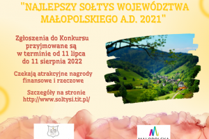 Konkurs "Najlepszy Sołtys Małopolski A.D. 2021" po raz 21-wszy organizuje Małopolskie Stowarzyszenie Sołtysów wraz z Urzędem Marszałkowskim Województwa Małopolskiego.