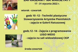 Dyrektor CKiP w Krościenku zaprasza dzieci i młodzież na zajęcia plastyczne i warsztaty które odbywać się będą w okresie ferii zimowych.