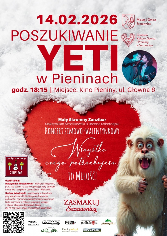 Szczawnica przygotowała kolejną propozycję dla miłośników kultury i muzyki. W sobotę, 14 lutego 2026 roku, w Kinie Pieniny odbędzie się koncert zimowo-walentynkowy pod hasłem „Poszukiwanie Yeti w Pieninach”. Na scenie wystąpi duet Mały Skromny Zanzibar, czyli Maksymilian Mroczkowski i Bartosz Kołodziejski.Walentynkowa atmosfera i muzyczne emocje