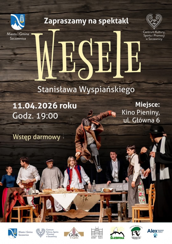 Miasto i Gmina Szczawnica oraz Centrum Kultury, Sportu i Promocji w Szczawnicy zapraszają na wyjątkowy spektakl „Wesele” Stanisława WyspiańskiegoJuż 11 kwietnia 2026 r. o godzinie 19:00