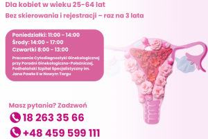 Jeżeli masz od 25 do 64 lat i w ciągu ostatnich 3 lat nie wykonywałaś badania cytologicznego, możesz skorzystać z bezpłatnego badania w ramach Programu Profilaktyki Raka Szyjki Macicy.