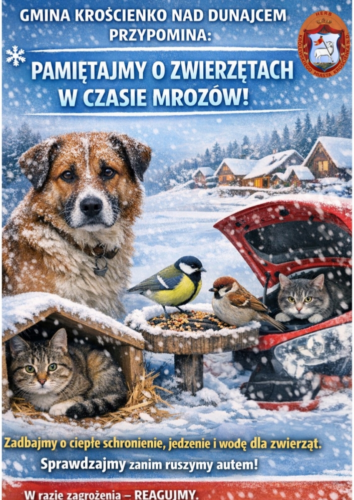 W związku z utrzymującymi się niskimi temperaturami Gmina Krościenko nad Dunajcem apeluje do mieszkańców o szczególną troskę o wszystkie zwierzęta. Mróz, śnieg i wiatr mogą prowadzić do wychłodzenia, chorób, a nawet śmierci zwierząt.