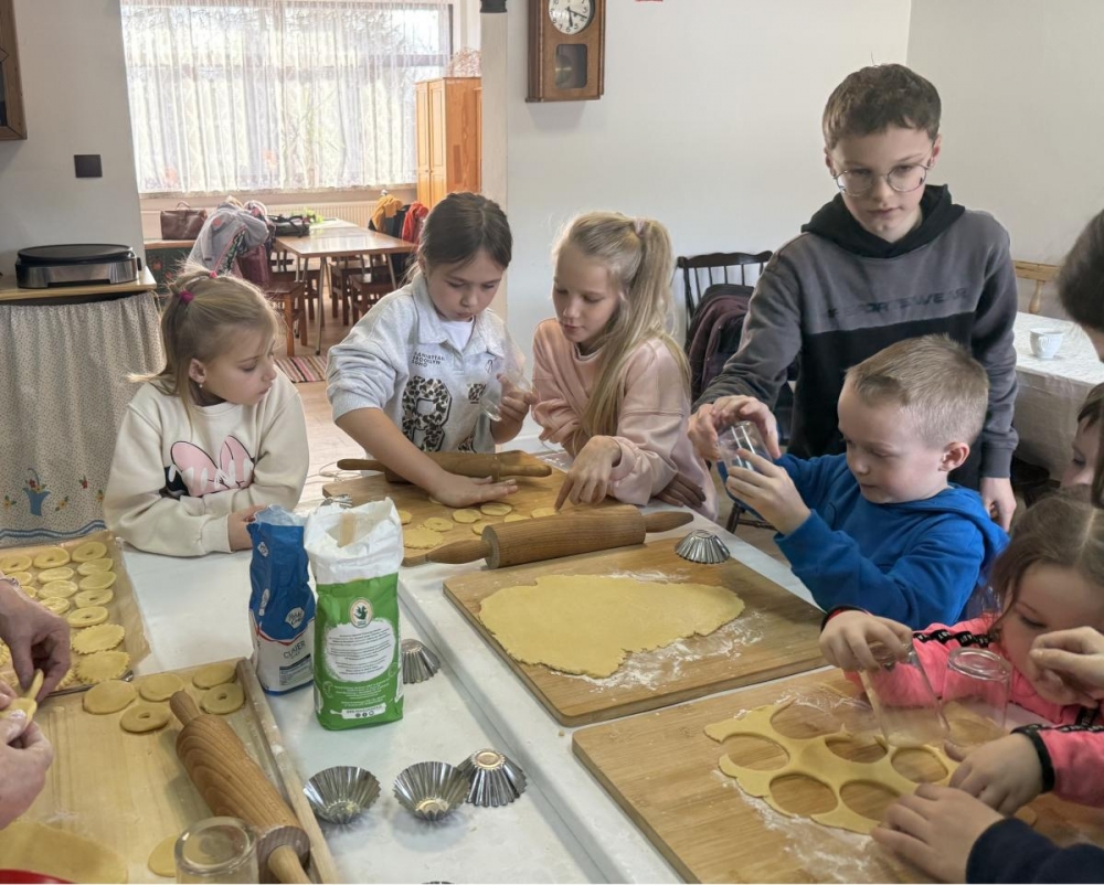 Program warsztatów był bardzo różnorodny. Dzieci chętnie uczestniczyły w zajęciach plastycznych, podczas których malowały, tworzyły biżuterię, ozdabiały słoiki, pracowały z gliną oraz przygotowywały wyjątkowe prace artystyczne. Dużym zainteresowaniem cieszyły się także spotkania kulinarne – wspólne pieczenie i dekorowanie ciasteczek, przygotowywanie faworków czy oponek dostarczyło uczestnikom nie tylko nowych umiejętności, ale również mnóstwo satysfakcji i uśmiechu.