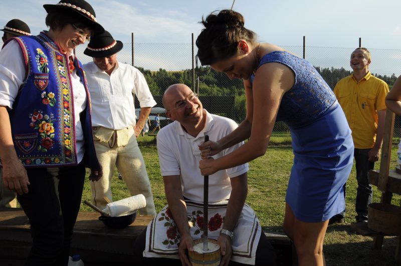 Dużo radości i zaciekawienie wzbudziło robienie masła w drewnianej kiernicce. Masło zaczął robić wójt Tadeusz Wach, a kończyli cepry i górale. To była nie łatwa praca, trzeba było włożyć wiele wysiłku i umiejętności aby po kilkunastu minutach ubijania 4 litrów śmietany uzyskać 2 kilogramy pięknie żółtego wiejskiego masła.