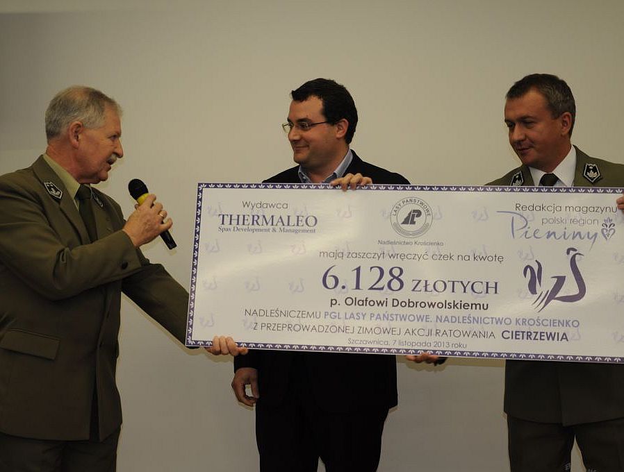 KROŚCIENKO. Na konferencji naukowej pt. „Natura 2000 – doświadczenie pienińskie”, która odbyła się w budynku Pienińskiego Parku Narodowego, prezes Zarządu Thermaleo Sp z o. o. Krzysztof Mańkowski, a zarazem wydawca magazynu Polski Region „Pieniny”, wręczył Nadleśnictwu Krościenko czek na kwotę 6.128 złotych na ratowanie cietrzewia w Pieninach.