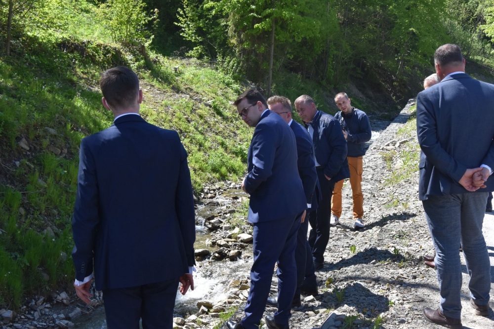 Następnie uczestnicy spotkania udali się w teren, w os. Gorcowe w Ochotnicy Dolnej, gdzie obejrzeli zabezpieczenia siatkowo – kamienne wykonane wzdłuż brzegu potoku i drogi gminnej, która ucierpiała podczas powodzi w 2018 r. Na miejscu zrealizowanej inwestycji Wojewoda spotkał się z Radnymi Rady Gminy z Ochotnicy Dolnej oraz Sołtysami – Sołtysem Sołectwa Ochotnica Dolna Wojciech Chlipała oraz Sołtysem Sołectwa Młynne Krzysztofem Jagiełą.