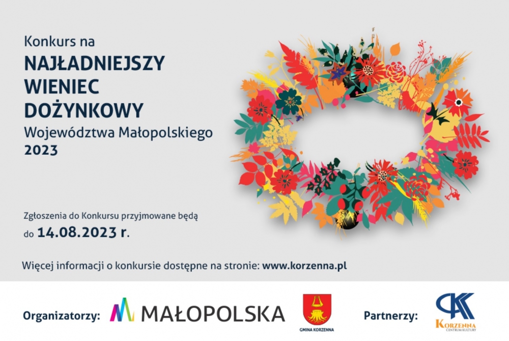 Marszałek Województwa Małopolskiego oraz Wójt Gminy Korzenna zapraszają do udziału w Konkursie na najładniejszy Wieniec Dożynkowy Województwa Małopolskiego. Celem konkursu jest kultywowanie i ukazywanie piękna tradycji zakończenia prac polowych, okazanie uznania dla rolników za ich trud, a także pokazanie szacunku dla chleba i budowanie tożsamości regionalnej.