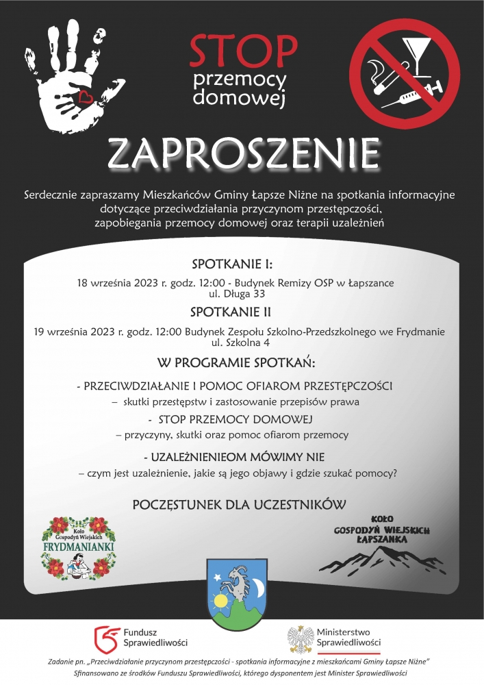 emtyka spotkań obejmować będzie zapobieganie przemocy domowej, przeciwdziałanie przyczynom przestępczości oraz terapię uzależnień. Wykłady zostaną przeprowadzone przez przedstawicieli Posterunku Policji w Łapszach Niżnych, Ośrodka Pomocy Społecznej w Łapszach Niżnych oraz przez terapeutę ds. uzależnień. Poczęstunek dla uczestników zapewnią działające na terenie gminy Koła Gospodyń Wiejskich w Łapszance i Frydmanie.