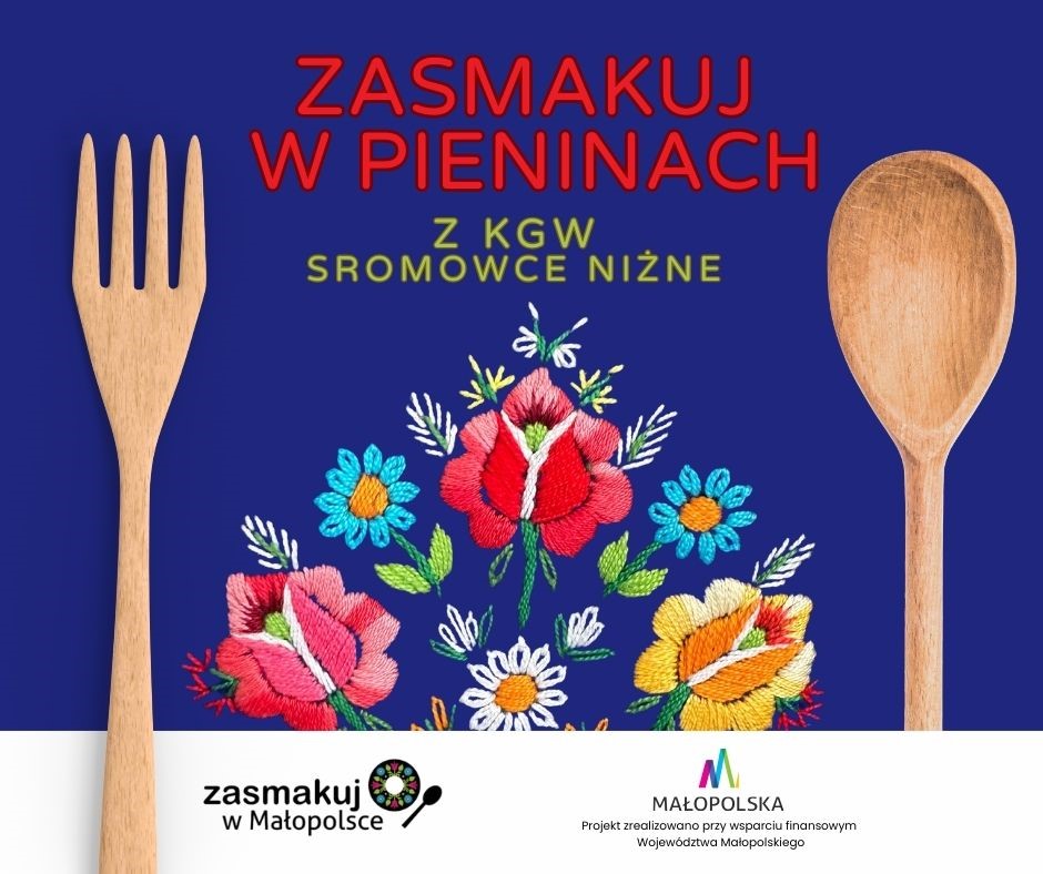 Grafika promująca projekt "Zasmakuj w Pieninach z KGW Sromowce Niżne" to nie tylko zaproszenie do smakowania - to także ukłon w stronę lokalnego dziedzictwa i kobiet, które je tworzyły.